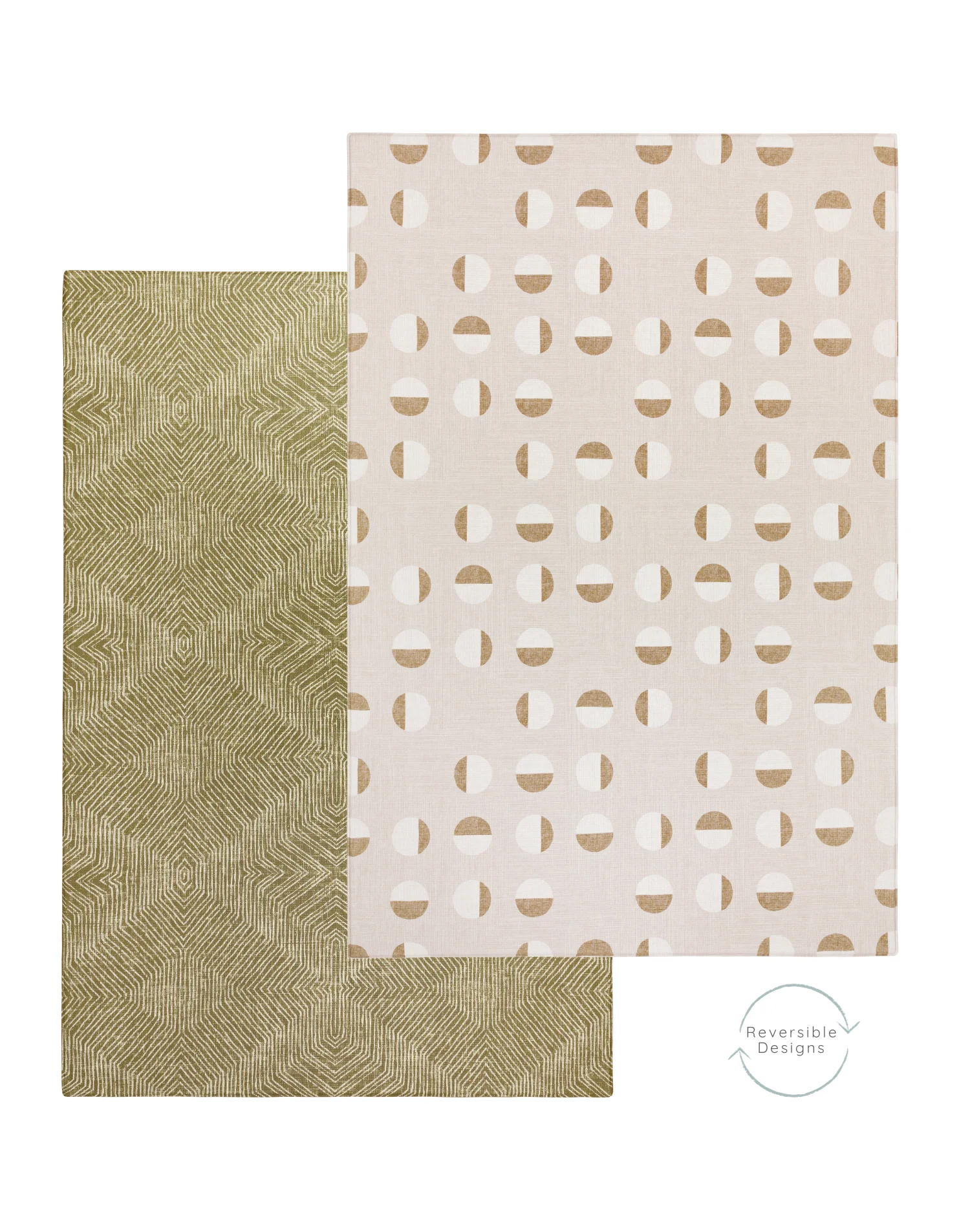 Inspired by patterns of the sun, The Solstice play mat features organic circular shapes in aged brass and lunar white. Modern yet versatile, this design brings a gentle warmth to any space it is unrolled in and provides support from the flooring underneath. Swap out your textile area rug for this wipeable, bounce back memory foam play rug that the whole family will adore.